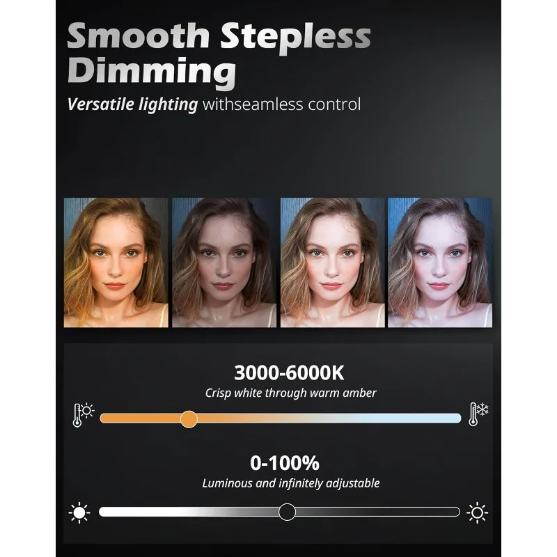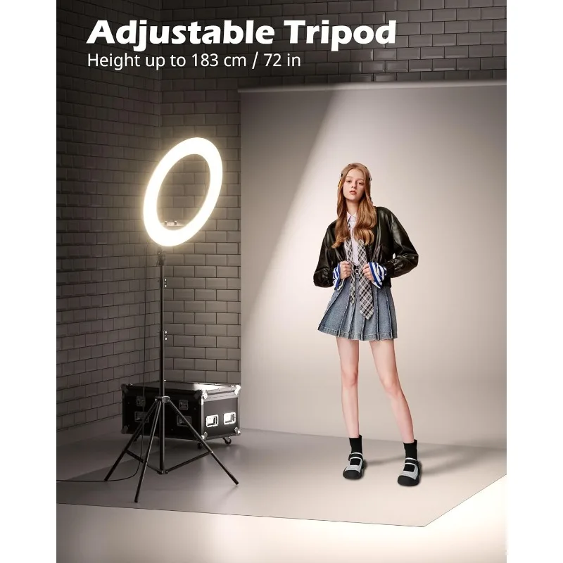 【Professional Lighting Effects】The ring light uses high-quality lens beads to diffuse light evenly, minimizing shadows and hotspots. With a color temperature range of 3000-6000K and smooth dimming, users can easily switch from cool blue to warm amber for the ideal atmosphere and realistic skin tones. It also provides ample lighting in any environment, greatly improving shooting quality.