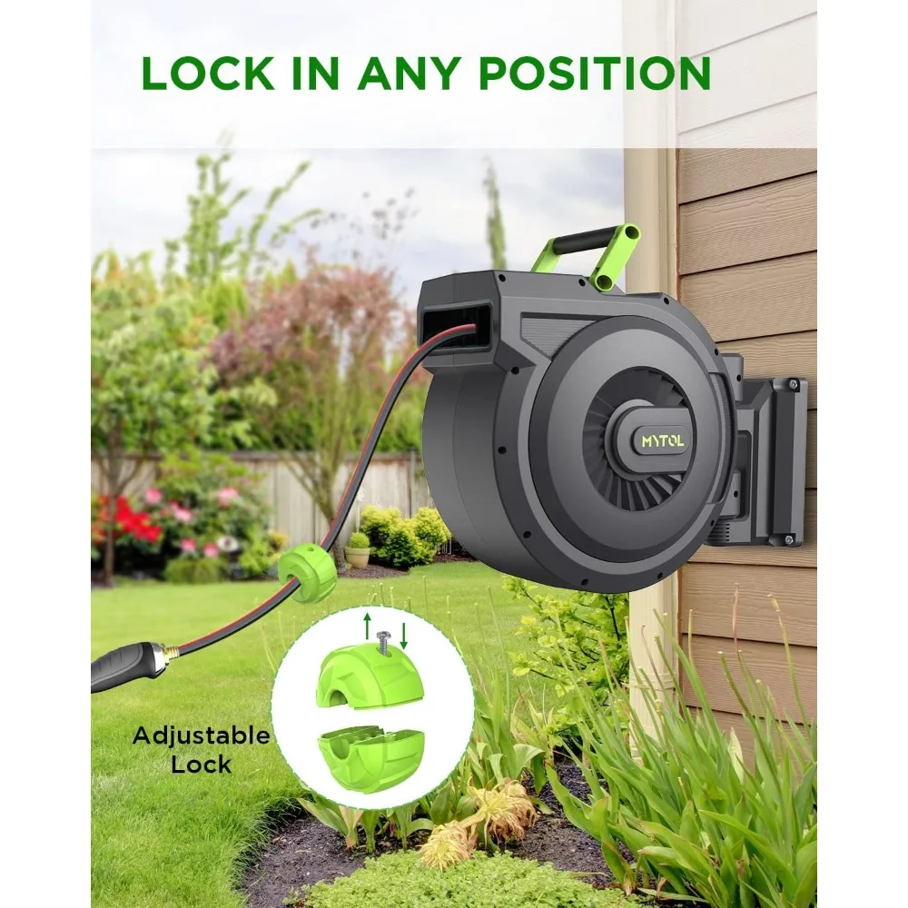 Retractable Garden Hose Reel, 1/2 Inch x 100 ft + 6 ft Wall Mount Hose Reel with Automatic Slow Rewind System, Any Length Lock