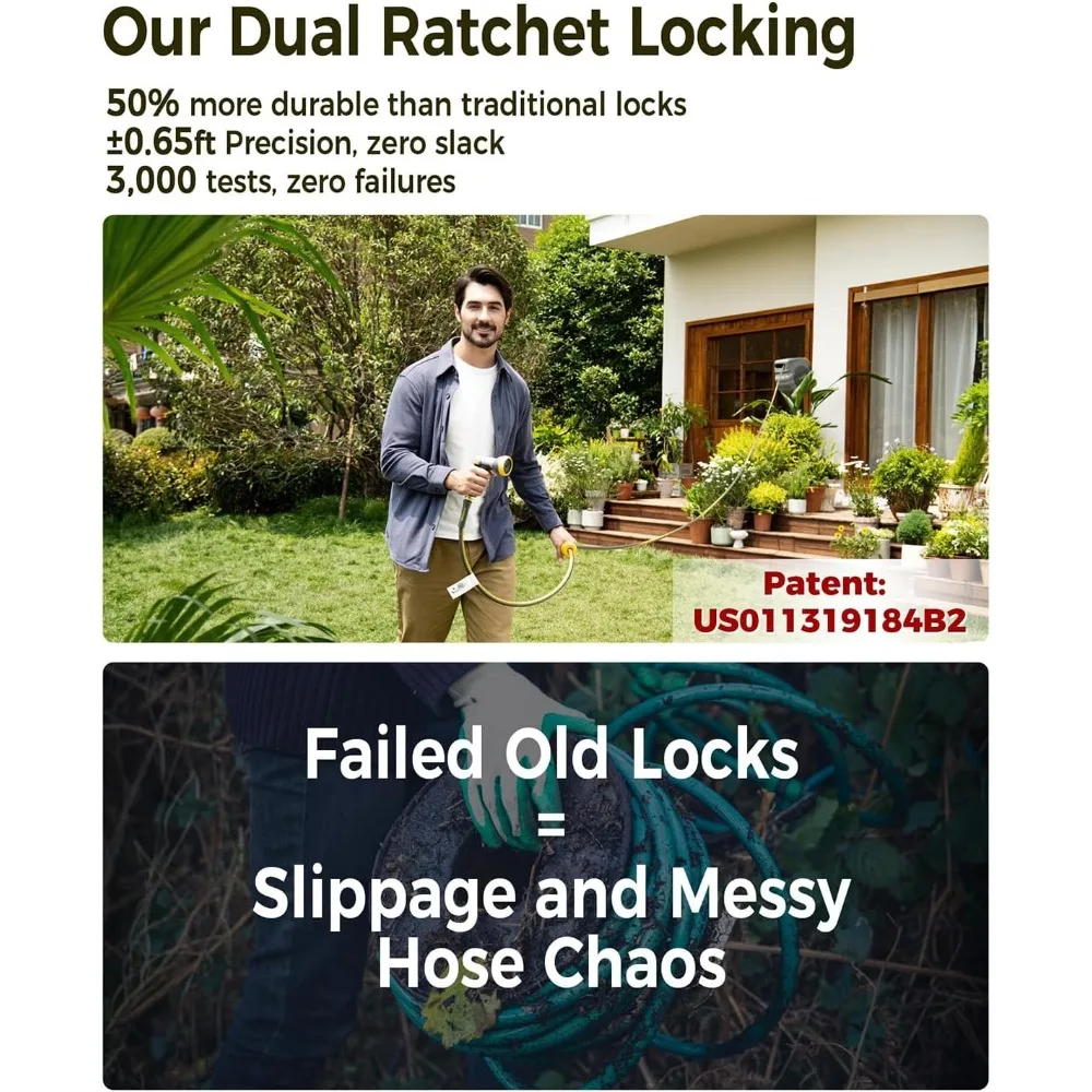 Here's a description of the item without the brand name, warranty information, chemical substances, or special symbols: High-flow rapid watering: The retractable hose reel features a 5/8 inch by 100-foot hose that reduces water pressure loss by 35% over long distances compared to 1/2 inch hoses, saving 80 minutes per session for irrigating large gardens. Ideal for large-scale, high-efficiency tasks. Precision dual ratchet locking: The auto rewind water hose reel passes 3,000 rigorous tests with ±0.65 ft locking accuracy. 50% more durable than traditional locks, it eliminates hose slack and secures exact lengths, ensuring precise positioning without dragging excess hose. 20,000-cycle self-winding system: Industrial-grade alloy spring ensures consistent retraction force. The self-winding hose reel retracts 20% slower to prevent whipping hazards while achieving 90% faster storage with smooth, tangle-free operation. UV and freeze-proof durability: Built for outdoor use, these water hose reels feature a UV-resistant coating tested from -4°F to 122°F, doubling lifespan by resisting cracks, fading, and weather damage. Burst resistant hose: The hose on this hose reel for outside features 3-layer construction with reinforced fiber braid, tested to 348 PSI burst pressure (3X the 120 PSI working pressure). This safety margin ensures no leaks or bursts for 2+ years of stable use. Self-aligning zero-friction guide: Self-lubricating nylon track reduces friction by 60% (3,000-cycle tested), ensuring smooth retraction and perfect hose alignment to prevent jams or tangles. 220 lb heavy-duty wall mount: The wall mounted hose reels reinforced bracket and metal-nylon composite tubing pass static load tests. Hidden handle and quick-release design enable 3-second disassembly for compact storage. 9-spray versatile nozzle: Switch between mist, jet, fan, and 6 other patterns for gardens, cars, or cleaning. Ergonomic non-slip grip enhances control.